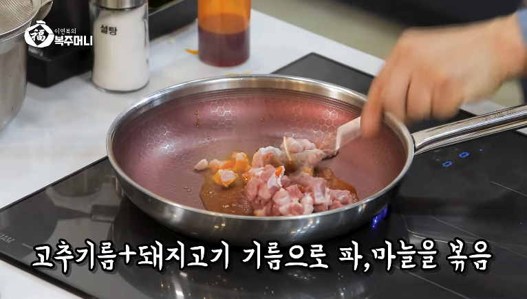 3. 돼지고기를 먼저 넣고 고추기름에 80% 익을 때까지 볶습니다.