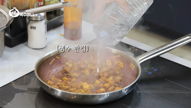 5. 간장 1.5스푼, 물 0.5컵, 굴소스 1스푼, 설탕 1스푼 을 넣습니다.