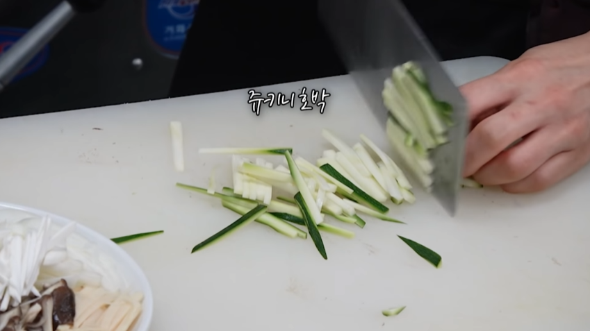 3. 양파, 새송이버섯, 쥬키니호박을 채 썰어줍니다.