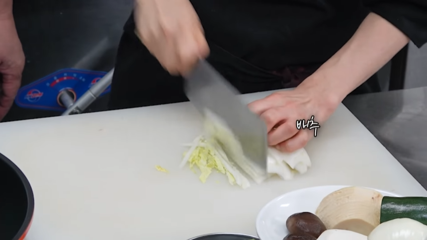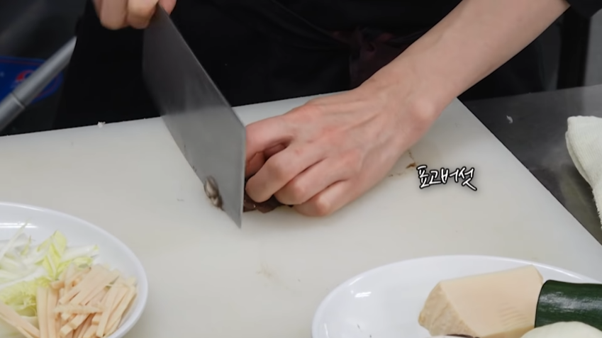 2. 돼지고기, 배추, 죽순, 표고버섯 채 썰어줍니다.