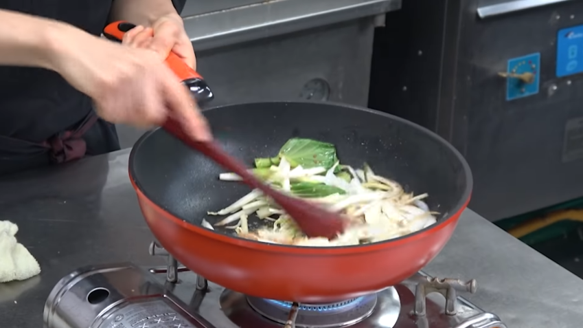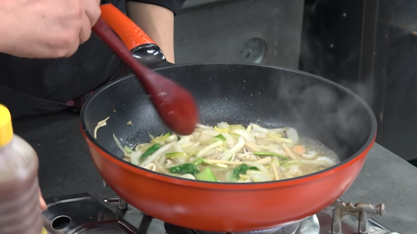 액상 치킨스톡 (냉면 그릇 물 2/3 정도에 치킨스톡 한 스푼), 배추 30그램 , 양파 1/5개 , 돼지고기 채썰기 , 죽순 10그램 , 표고 1개 , 팽이버섯 1/5 봉지, 새우 조금, 오징어 조금, 부추 조금, 식용유 볶음용 , 대파 조금, 마늘 7-8개 다진 거
