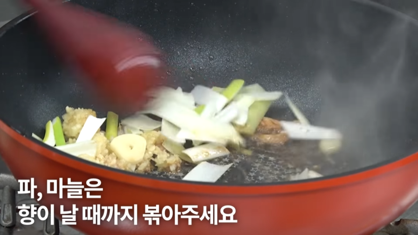 6. 돼지고기를 우선 볶은 다음 파, 마늘을 넣고 볶아줍니다.
