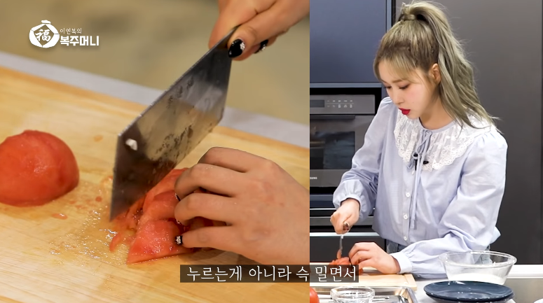 5. 먹기 좋게 삶은 토마토를 촵촵 썰고 풀어진 계란에 넣어줍니다. 으깨지지 않게 주의!