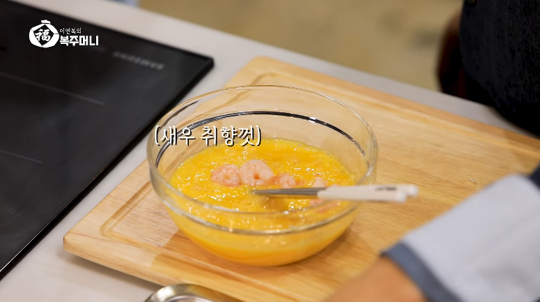 3. 삶은 새우를 계란에 넣고 조금 더 섞어줍니다.(기호에 따라 재료를 넣고 빼주세요)