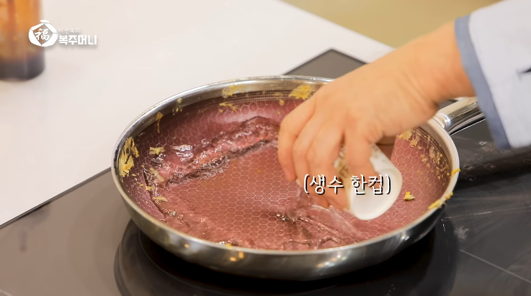 1. 볶았던 팬에 물 한 컵, 간장 1스푼, 굴소스 7부, 맛술 1스푼, 설탕 반 스푼을 넣고 저어줍니다.
