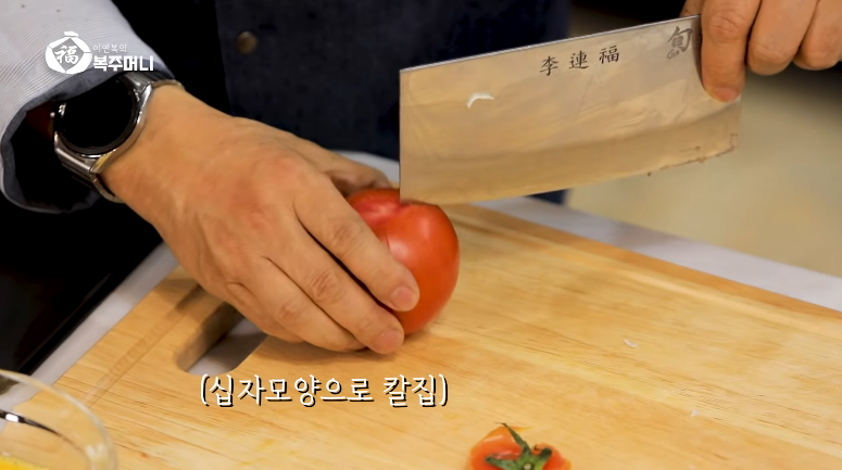 4. 토마토 꼭지를 제거 후 칼집을 내어 삶은 물에 15초 정도 넣고 굴린 후 껍질을 벗겨줍니다.