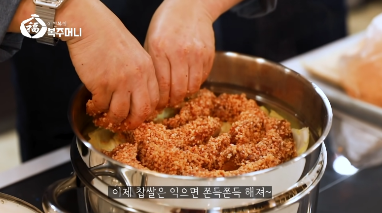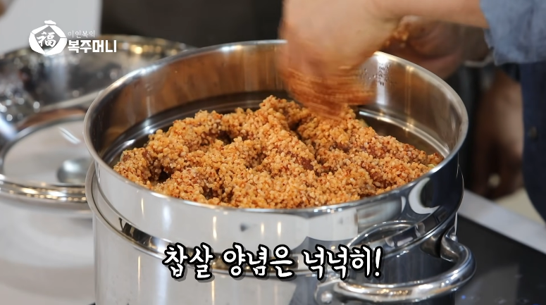 2. 숙성된 양념 등갈비를 찜기에 넣고 남은 찹쌀도 같이 넣어 20분 쪄줍니다.
