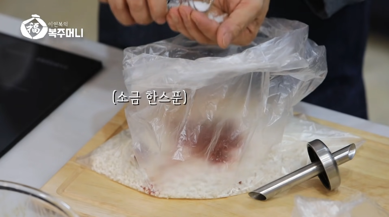 4. 한시간 정도 불린 찹쌀을 비닐봉지에 넣고 고춧가루 5스푼, 소금 1/2스푼을 넣고 곱게 빻거나 갈아줍니다.