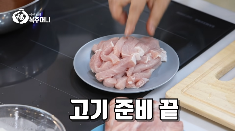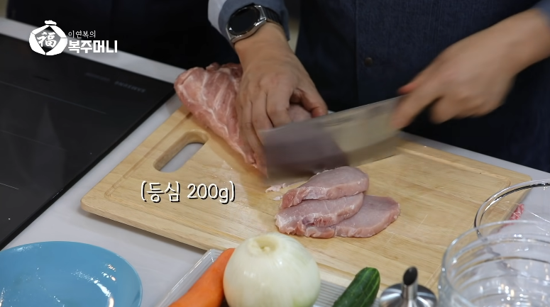 1. 돼지고기 등심 200g을 준비하여 키친타올로 수분을 제거 후 손가락 사이즈?로 썰어줍니다.