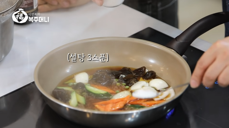 3. 물이 끓고 있을 때 야채를 넣고 설탕 3스푼을 넣고 잘 휘저어 줍니다.