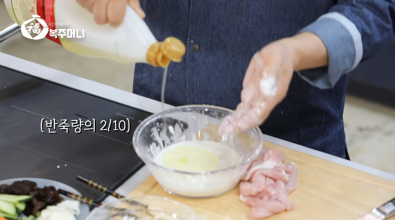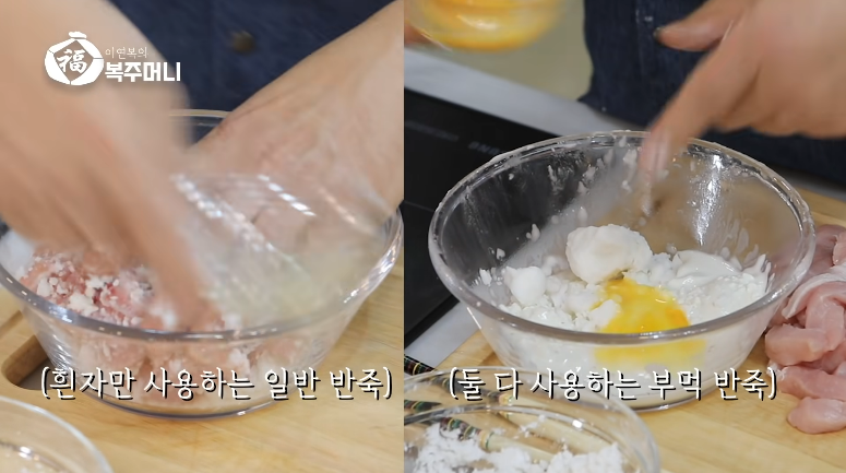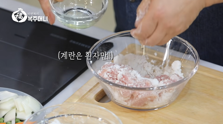 1. 감자전분에 계란흰자 1개를 넣고 고기와 섞어줍니다.