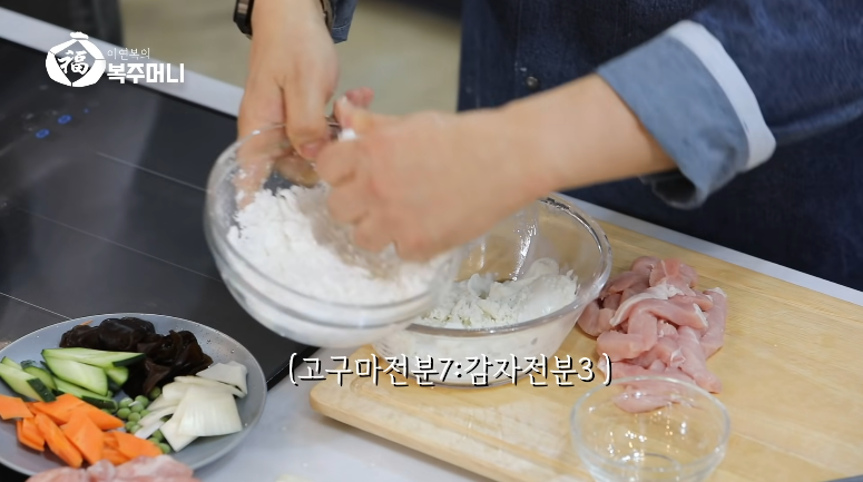 1. 고구마전분 7/10, 감자 3/10, 계란 1개, 식용유 2/10