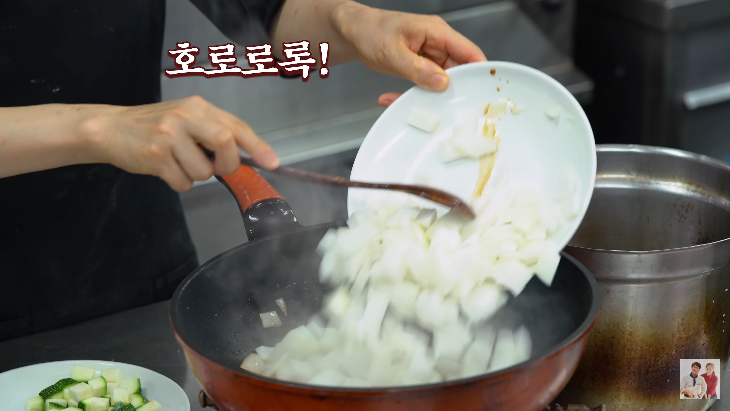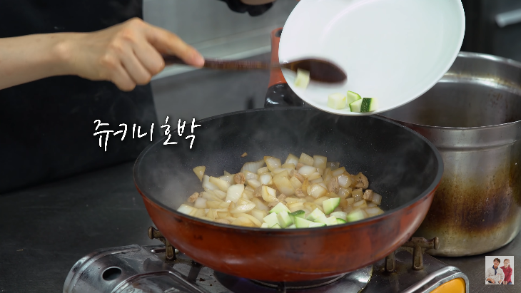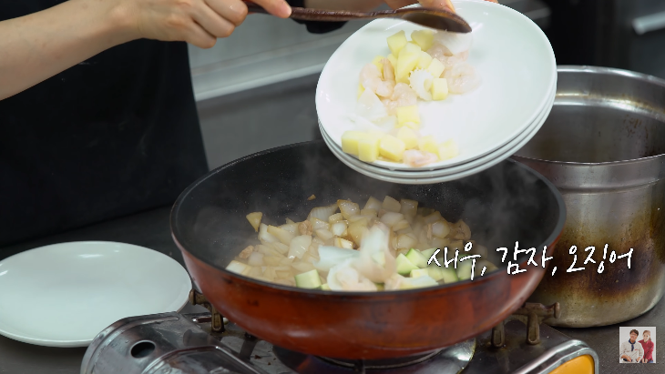 5. 양파를 전부 넣는다. 한숨 죽을 때쯤 호박과 감자를 넣고 익힌 새우도 넣고 볶는다.