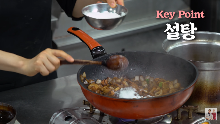 7. 약간의 물을 넣고 굴소스와 설탕을 넣어주면서 간을 맞추고 물 전분을 풀어 걸쭉하게 하여 짜장 소스를 완성시킨다.
