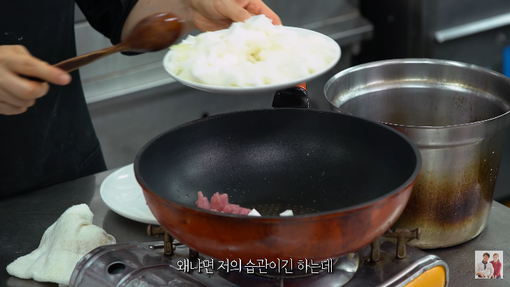 3. 팬에 식용유를 넣고 썰어 놓은 고기와 양파 일부분을 넣고 볶는다.