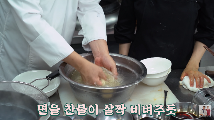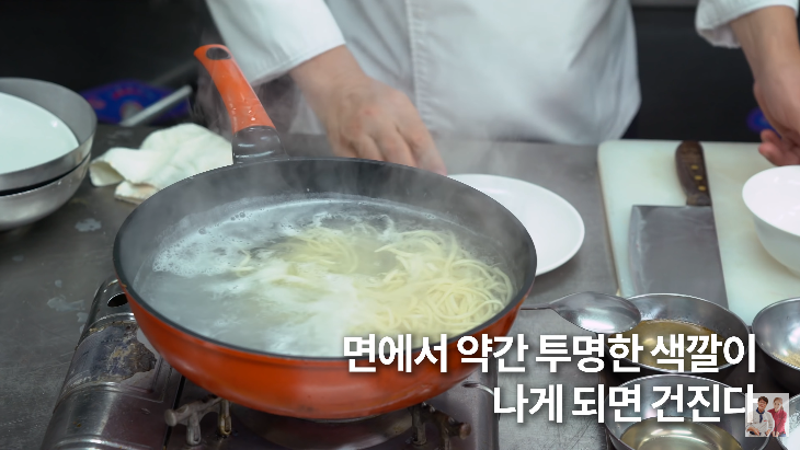 8. 물을 끓이고 국수를 두 번에 걸쳐 삶고 익힌 후 차가운 물에 담갔다.