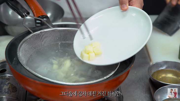 2. 감자는 썰어 미리 물을 끓여 삶아 놓는다. 새우는 미리 삶아 놓는다.