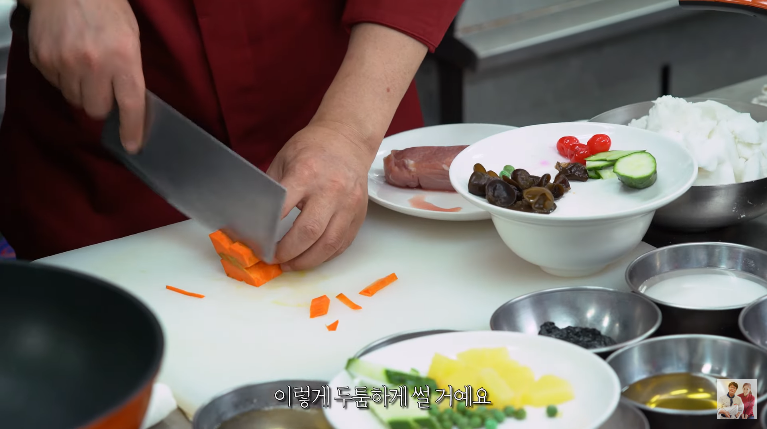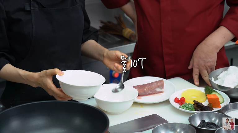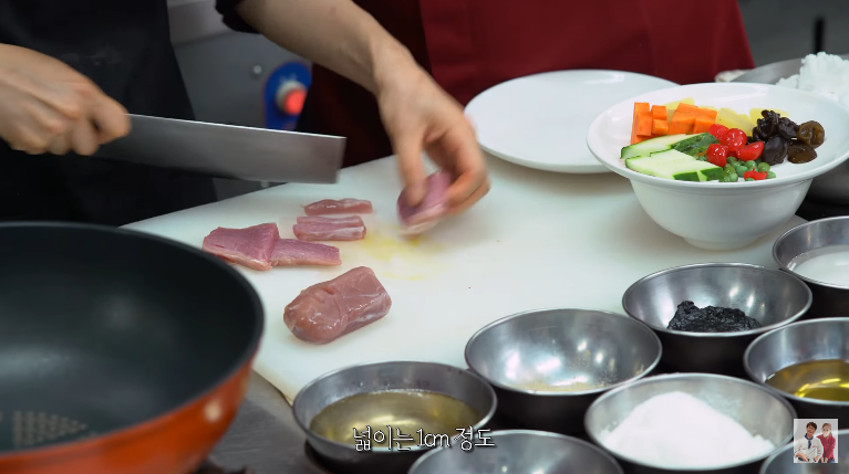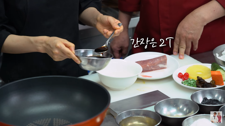 돼지고기 안심 120그램, 100% 감자전분, 튀김용 식용유, 물 10스푼, 설탕 3,5스푼, 간장 2스푼, 식초 3스푼, 오이 3쪽, 당근 2쪽, 불린 목이버섯 2-3개, 병 빨간 체리 3개, 통조림 파인애플 1쪽