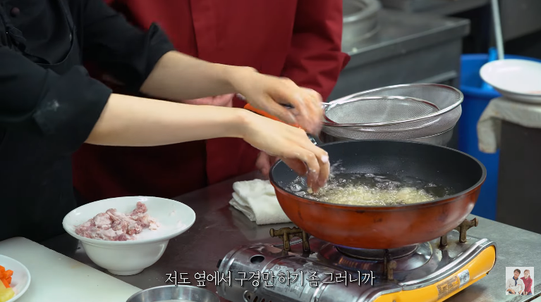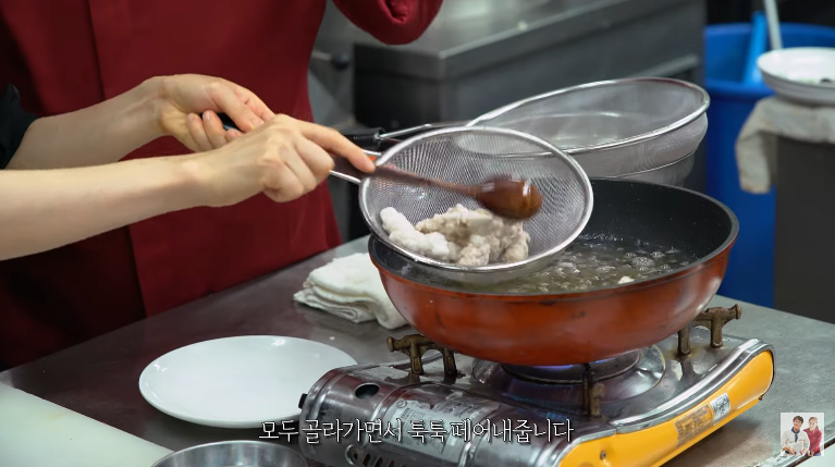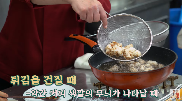 3. 중간에 왼손 조리 오른손에 수저나 국자로 잡고 튀김 고기를 계속 톡톡 쳐줍니다.
