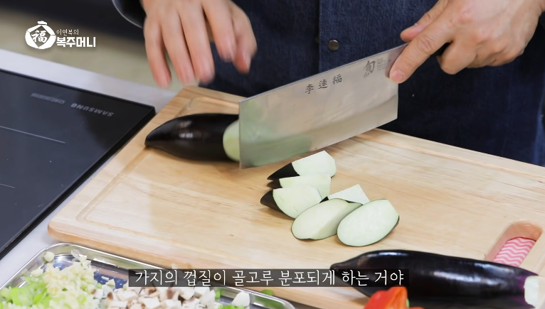 3. 가지 3개를 돌려가며 어슷하게 썰고 달궈진 웍에 적당히 튀겨줍니다.