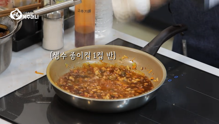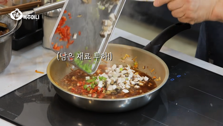 남은 재료를 다 넣어 볶은 후 불을 약하게 줄여 졸여줍니다.