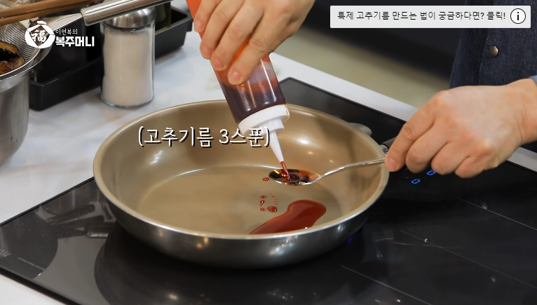 1. 달궈진 팬에 고추기름 3스푼을, 대파, 다진 마늘을 넣고 향을 돋궈줍니다.