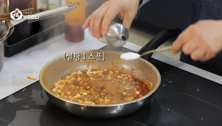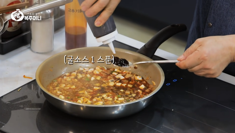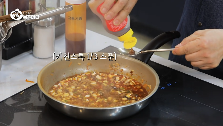 3. 간장 1스푼, 맛술 2스푼, 두반장 1/2스푼, 굴소스 2스푼, 치킨스톡 1/3스푼, 설탕 1스푼을 넣고