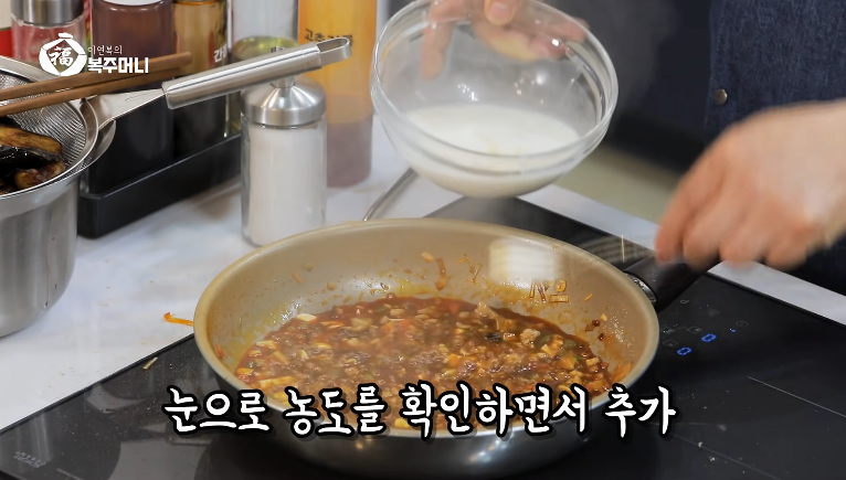 4. 전분물을 한 스푼씩 넣으며 농도를 확인합니다.