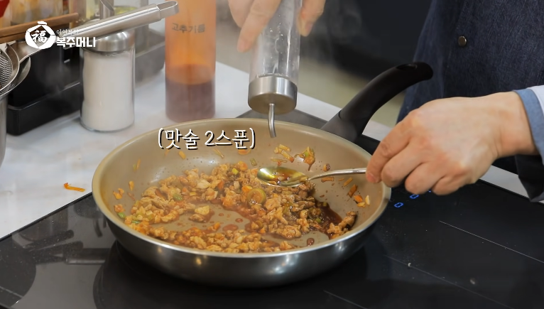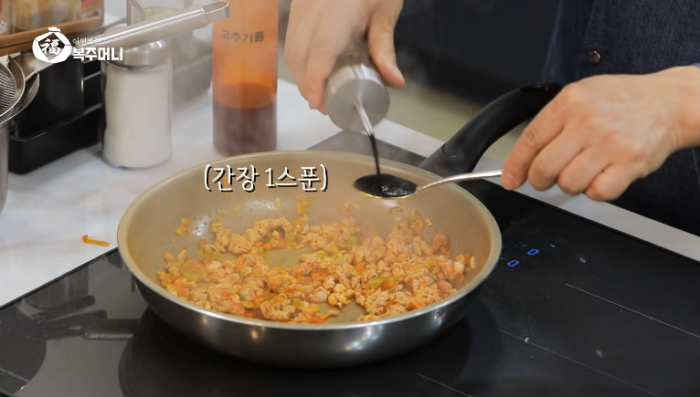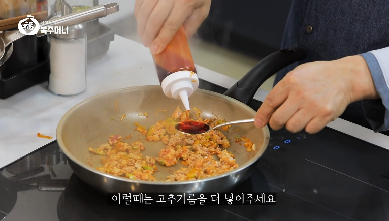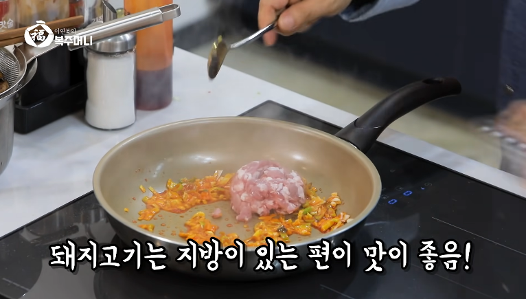 2. 다진 돼지고기를 넣고 볶아줍니다. 너무 말라있으면 고추기름 1스푼 더 넣어도 좋습니다.