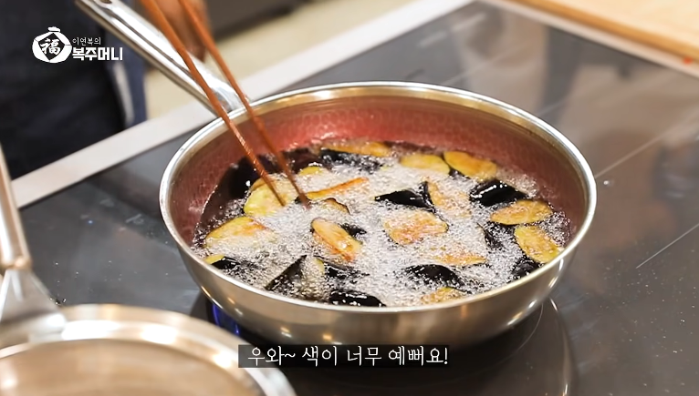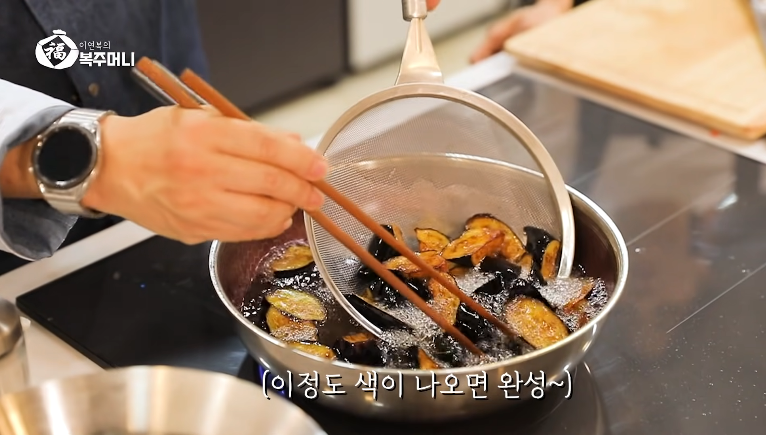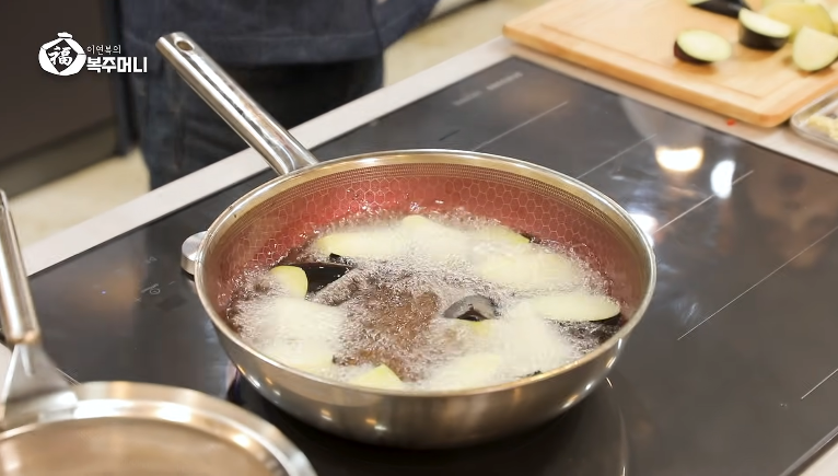 1. 웍에 가지가 잠길 정도로 기름을 붓고 가열합니다. (180도)